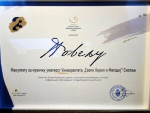 Највисоката награда ПОВЕЛБА за Факултет за музичка уметност – Скопје и   деканката проф. м-р Дарија Андовска за успешна континуирана соработка и афирмација на меѓународниот углед на Факултетот за уметности во Ниш по повод Денот на Факултетот и студентите.