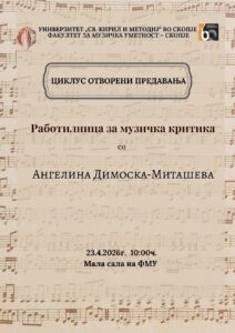 На 23.4.2026г. со почеток во 10:00ч. во малата сала на ФМУ – Скопје, во рамки на Циклусот отворени предавања, ќе се одржи Работилница за музичка критика со предавач Ангелина Димоска Миташева.