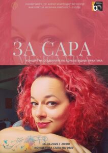 Почетна | Новости | 24.03.2026 „Музика Вива“ – „За Сара“ На 16.3.2026 година во рамки на циклусот концерти „Музика Вива“ се одржа концерт „За Сара“ во чест на нашата прерано почина, драга професорка и колешка, Сара Пројковска. ᐸ Претходна вест„Музика Вива“ - „Австриска вечер“ Следна вест ᐳ„Нови Хоризонти"